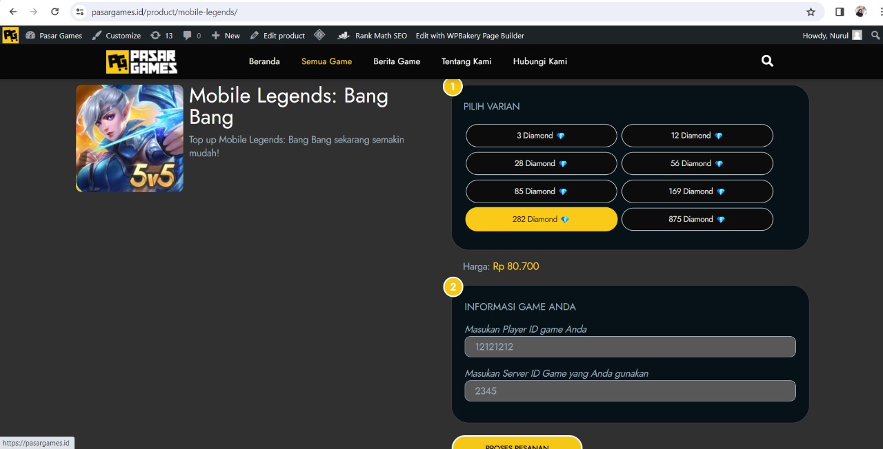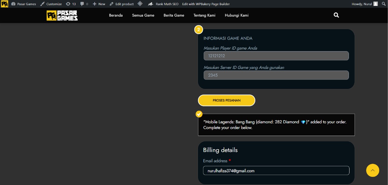 Pilih varian produk yang diinginkan dan lengkapi informasi player ID Game, Server ID (jika ada), dan Email yang sesuai.